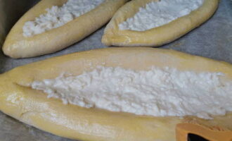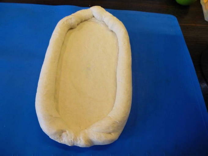 - Een beetje kaasvulling zonder eieren wordt langs de randen gelegd, de randen worden in rollen gerold om de zijkanten voor de boot te vormen en vervolgens geknepen.