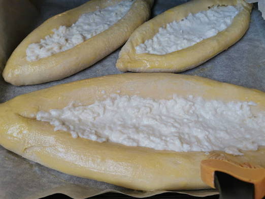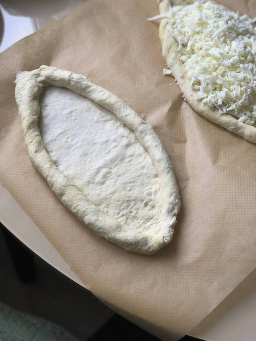 - Khachapuri "Boat" van gistdeeg in de oven