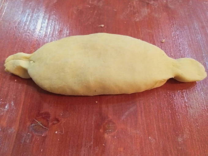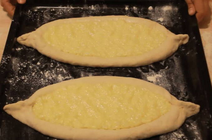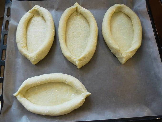 - Het resulterende deeg wordt in verschillende delen verdeeld (bijvoorbeeld 4) en van elk wordt een cake gevormd.De randen zijn opgerold en een soort bootje gemaakt, geknepen zodat de vulling in het bootje kan blijven.