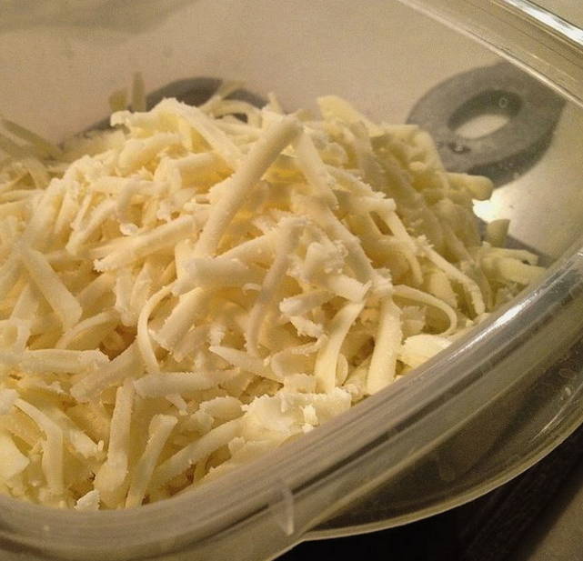 - Bereide geraspte kazen, water en een ei worden gemengd in een container met een geschikt volume.