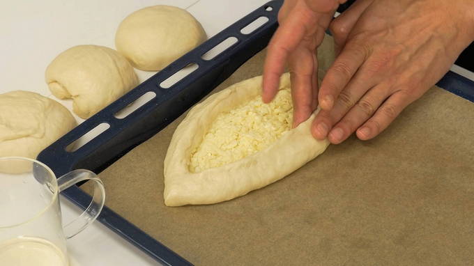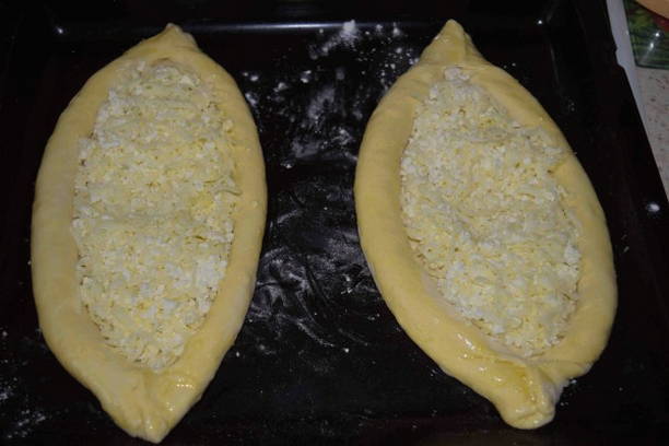 - Een boot is gemaakt van een cake, waarbij de randen met een rol naar het midden worden gedraaid en de hoeken worden geknepen. In het midden tussen de gevormde zijkanten wordt de kaasvulling verdeeld en wordt het deeg zelf rond de vulling ingesmeerd met eiwit. Gedurende 10-15 minuten laat men de khachapuri op kamertemperatuur komen.