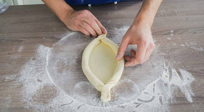 - Het deeg is verdeeld in 4 delen, elk wordt dun uitgerold tot een cirkel, de randen worden tot een buis gevouwen en de uiteinden worden verbonden om een soort boot te maken.