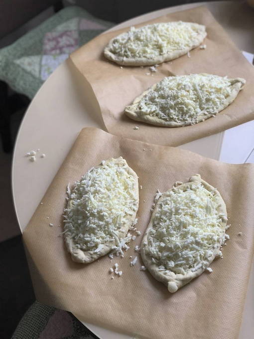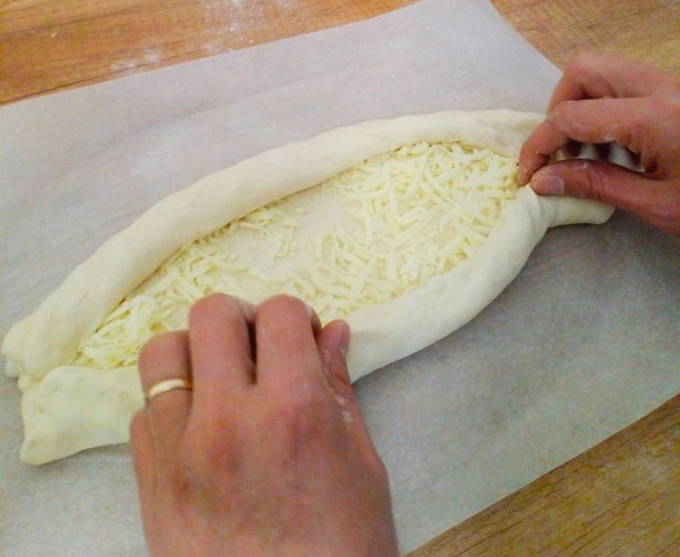 - Elk moet goed worden bestrooid met geraspte kaas en de randen van het deeg worden opgerold en samengeknepen om een boot te vormen met kaasvulling in het midden.