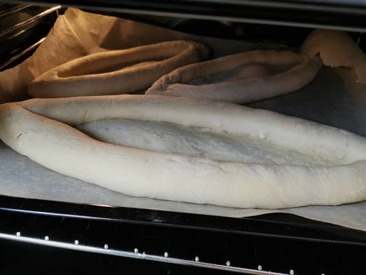 Het deeg wordt tot een bal gerold, bedekt met een servet en 2 uur gelaten om te rijzen. Na de aangegeven tijd wordt het deeg gekneed en nog 1,5 uur gelaten. Nadat ze in verschillende delen zijn verdeeld (er kunnen er 5 of 6 zijn), wordt elk in een bal gerold, bedekt met een servet en een beetje groter gemaakt. Vet de bovenkant in met olie zodat het deeg niet barst.