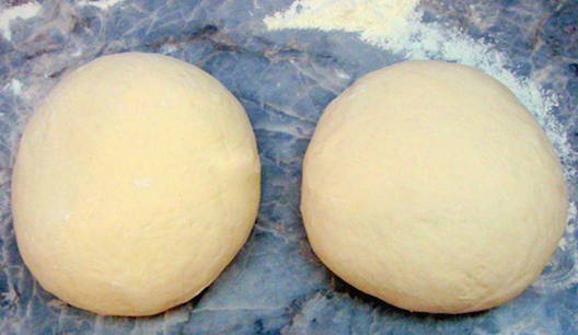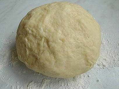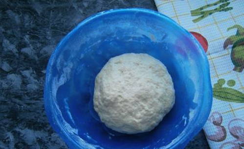 - Zeef bloem in een diepe kom, voeg gist, zout en suiker toe, meng. Giet er dan warm water bij en kneed het deeg. Dek het deeg af met een handdoek en laat het op een warme plaats staan.