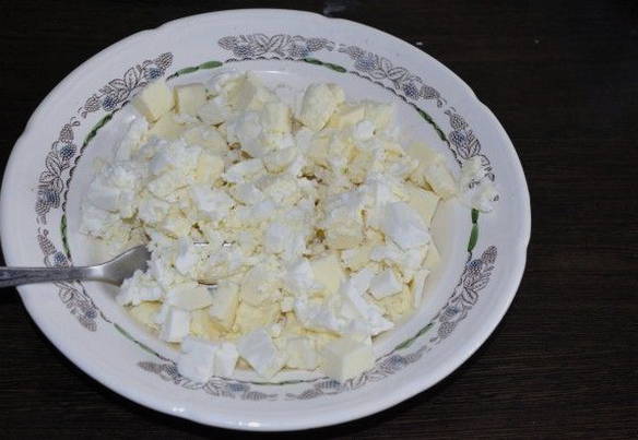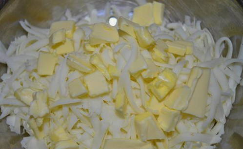 - Bereid de vulling voor. Rasp de kaas, snijd de boter in kleine blokjes en giet er een beetje water bij.