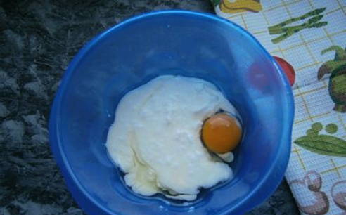 - Giet warme kefir, plantaardige olie in een kom, breek een ei en voeg zout toe, meng.