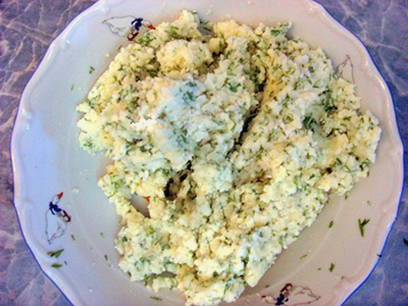 - Rasp de kaas op een grove rasp, voeg gehakte dille, room en een beetje zout toe.