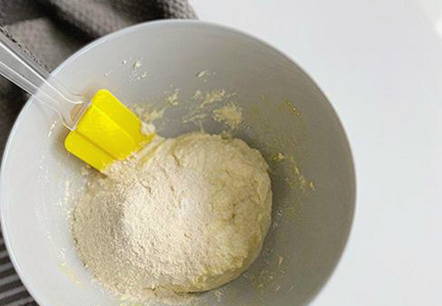 - Voeg vervolgens de gezeefde bloem en het bakpoeder voor het deeg toe, meng.