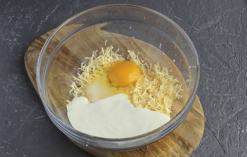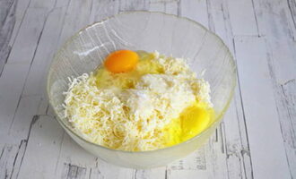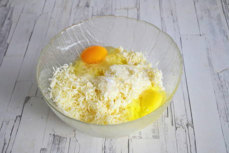 Rasp de kaas voor de vulling op een grove rasp. Meng het met twee eieren, zout een beetje.