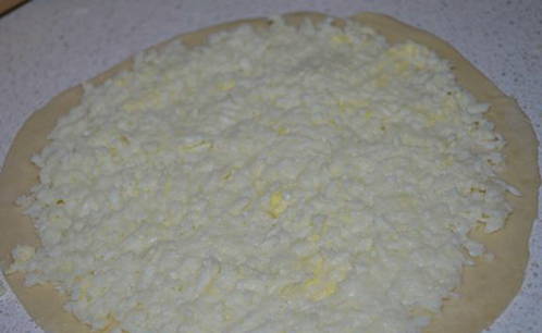 - Rasp Adyghe en Russische kaas en meng. Verdeel het deeg in 8 delen, rol elk in een dunne cake. Leg de vulling op de tortilla's.