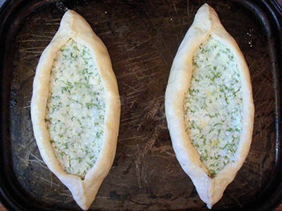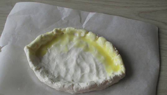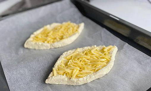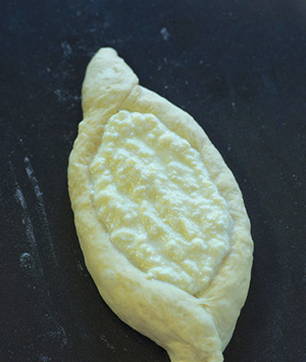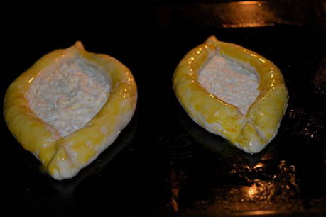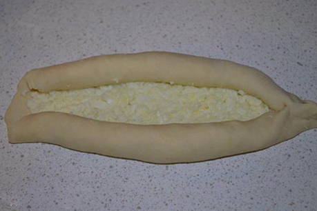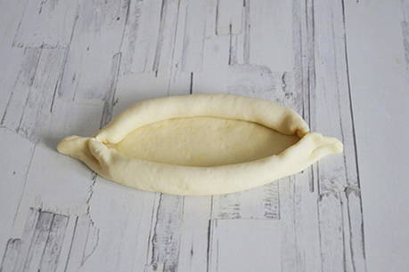- Rol het deeg uit tot twee ovale cakes. Leg de kaasvulling neer zonder een paar centimeter tot aan de rand te komen. Rol vervolgens de randen op en geef de plano's de vorm van boten.