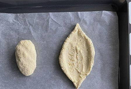- Bedek de bakplaat met perkament. Verdeel het deeg in twee delen, vorm ze in bootvormige blanco's.
