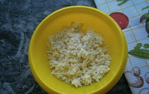- Rasp de kaas op een grove rasp. Giet water in de kaasmassa en roer, de vulling moet de consistentie van dikke zure room krijgen.