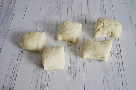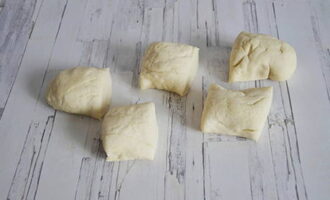 Wikkel het deeg dat met je handen omhoog is gekomen in en verdeel het in 5 gelijke delen.