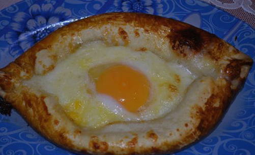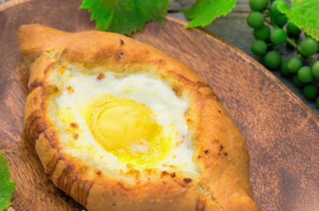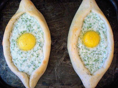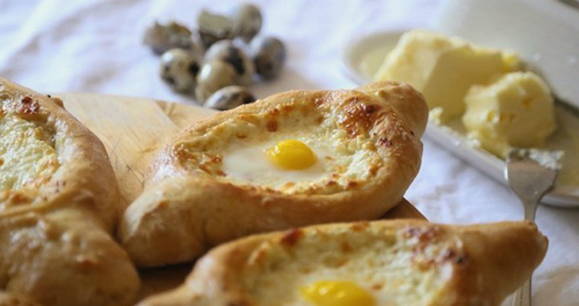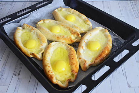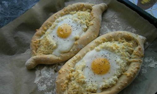 Een van de lekkerste soorten gistvrij gebak. De belangrijkste charme van Adzjarische khachapuri is dat je ze kunt eten door stukjes deeg in vloeibare dooier te dopen.