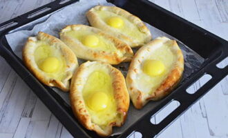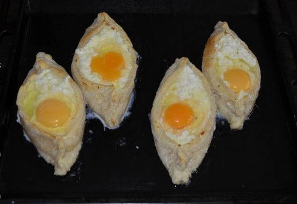 - Vet een bakplaat in met olie en leg de blanco's erop. Bak de khachapuri 20 minuten op 180 graden. Breek vervolgens de eieren en bak nog 5 minuten in de oven.