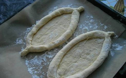 - Verdeel het bij elkaar passende deeg in 5-6 gelijke delen, rol ze in dunne cakes. Rol de randen van elke flatbread op en vorm de blanco's in de vorm van bootjes, leg ze op een ingevette bakplaat.