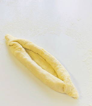 - Vouw de randen van de flatbread ongeveer 1/3 over beide kanten en knijp de randen dicht. Je krijgt bootvormige blanco's.