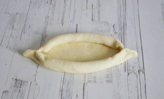 - Bedek de bakplaat met perkament. Verdeel het deeg in twee gelijke delen, rol ze uit, vouw de randen aan beide kanten om. Je hebt twee bootvormige blanco's.