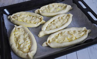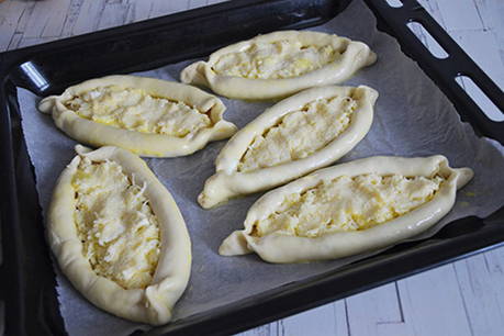 - Vul de bootjes met kaas. Bak de khachapuri 25 minuten in de oven op 180 graden.