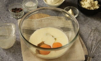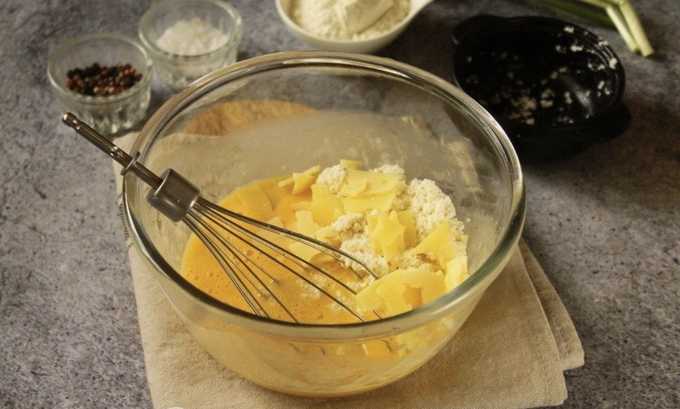 Voeg kazen toe aan de vloeibare massa. Ze kunnen worden geraspt, met de hand gebroken of gehakt. Naar eigen goeddunken.
