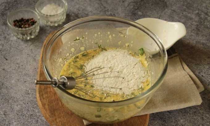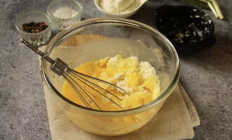 Voeg vervolgens gehakte kruiden, zout, zwarte peper toe en zeef de bloem. Klop de inhoud met een garde tot een klontje verdwijnt.