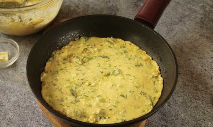 Verhit de koekenpan in boter. Giet het deeg erin en bak onder het deksel op middelhoog vuur. Het duurt ongeveer 3-5 minuten aan elke kant.