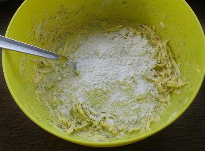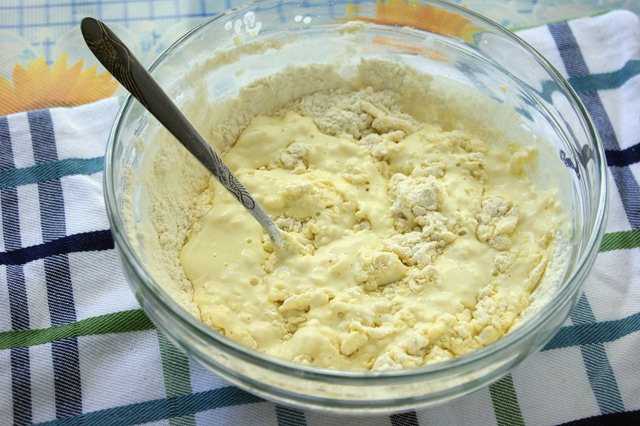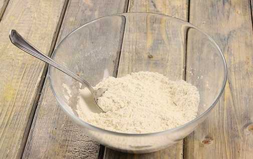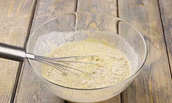 - Zeef de bloem samen met soda en zout. Breek het ei in het mengsel en giet de kefir erbij. Roer de ingrediënten grondig tot een homogeen deeg is verkregen.
