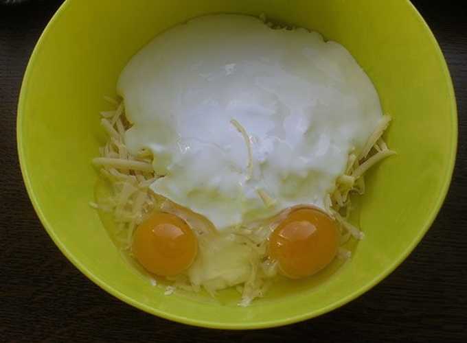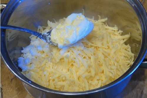 - Voeg drie eetlepels zure room toe aan de kaas. Het beste is om een vet en dik product te gebruiken.