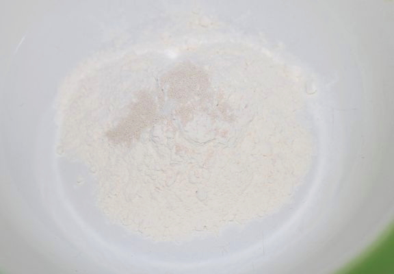 - Voeg zout en droge gist toe aan de bloem. Roer de ingrediënten.