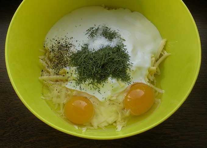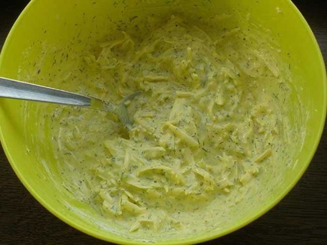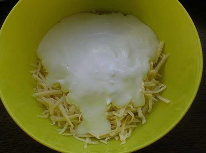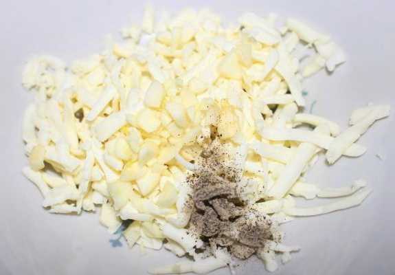 - Wrijf voor de vulling zachte kaas op een grove rasp en combineer met gemalen zwarte peper, mayonaise en gehakte teentjes knoflook.