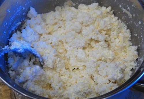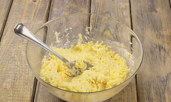 - Terwijl het deeg rust, beginnen we met het bereiden van de vulling. Wrijf de kaas in een diepe kom en voeg er twee eetlepels boter aan toe.