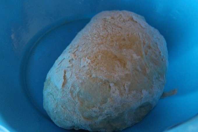 - Voeg koud gekookt water en plantaardige olie toe aan het droge mengsel. Kneed het deeg grondig tot een strakke bal en laat 40 minuten staan.