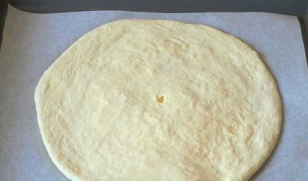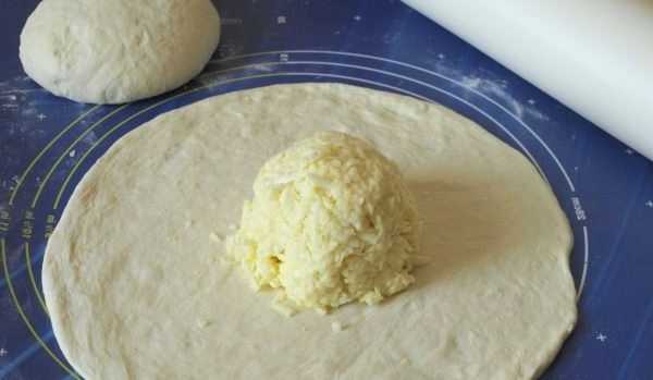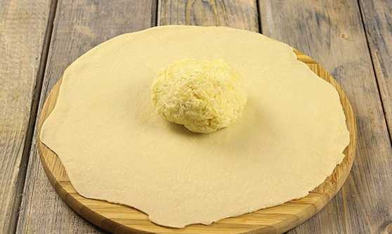 - Als het deeg omhoog komt, verdeel het dan in kleine, gelijkmatige stukjes. We rollen elk in een dunne cirkel, in het midden waarvan we de kaasvulling verspreiden.