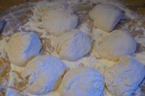 - Wanneer het deeg "rijpt", verdeel het dan in 6 gelijke delen. We kneden ze lichtjes met onze handen.