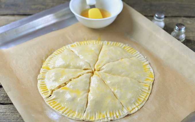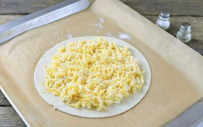 - We raspen twee kazen en roeren ze met één kippenei. Verdeel deze vulling vervolgens gelijkmatig over de bladerdeegcirkel.