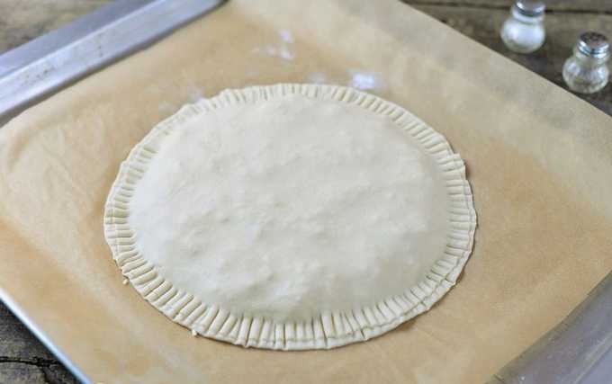 - We boetseren een bal uit de gesneden stukjes deeg en rollen deze tot een dunne cirkel, waarmee we onze vulling sluiten. Druk de randen voorzichtig naar beneden zodat de basis en bovenkant goed aan elkaar plakken.