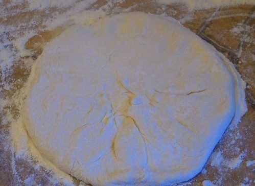 - Als het deeg gerezen is, verdeel het dan in vier gelijke klontjes.