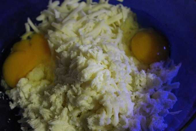- Vervolgens bereiden we de vulling voor. Suluguni wrijft op een grove rasp. Meng de kaas met twee kippeneieren.