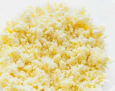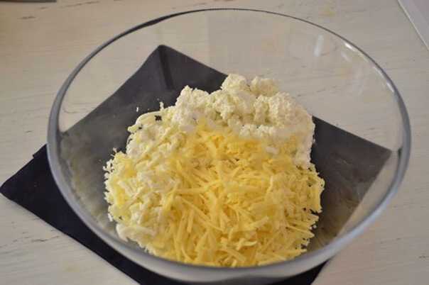 - Suluguni wrijft op een grove rasp. Kneed de kwark met een vork. We combineren beide producten in een gemeenschappelijk bord.