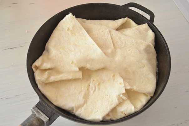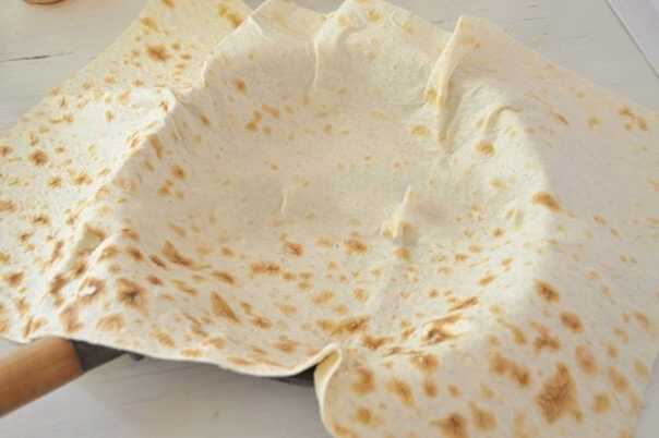 - Bestrijk vervolgens de pan met boter. We smeren er dun pitabroodje op in twee lagen zodat de randen naar beneden hangen.