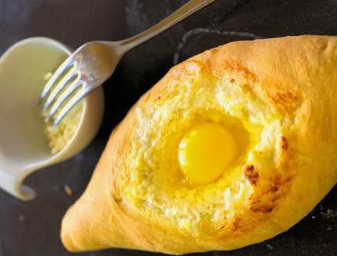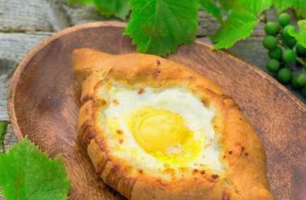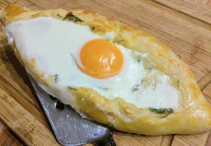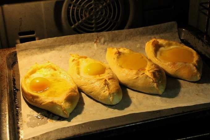- We halen hete khachapuri met ei en kaas uit de oven en serveren. Klaar!