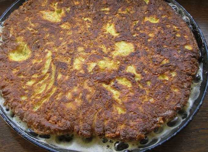 - Verwarm een koekenpan voor met plantaardige olie. Verdeel het resulterende deeg gelijkmatig.