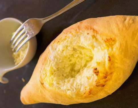 Khachapuri van gistdeeg komt luchtig en zacht uit. Een delicate kaasvulling maakt het gerecht nog sappiger en smakelijker. Kan als tussendoortje geserveerd worden.