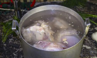 - Het vloeistofniveau in de pan moet 20 centimeter hoger zijn dan de vleeslaag. Zet de pan op het vuur, breng aan de kook, zet het vuur laag en laat 8 uur sudderen, regelmatig afschuimen.