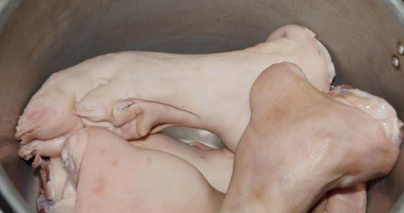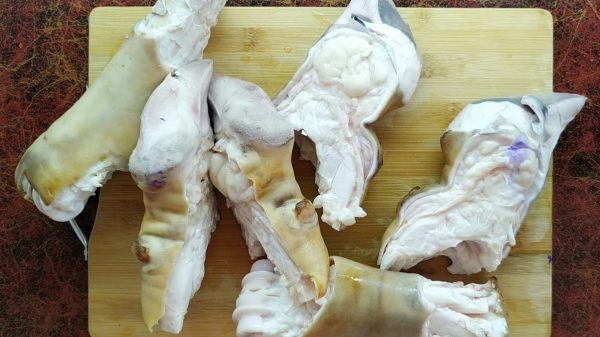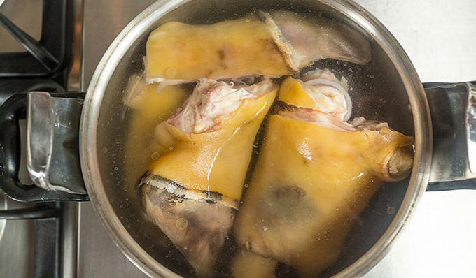 - Was de varkenspoten, schil ze, snijd ze in kleine stukjes, bedek ze met water en laat ze een nacht staan.