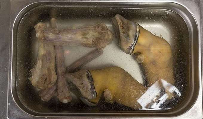 - Was de runderpoten, schil ze, halveer ze, vul ze met koud water en laat ze een dag staan. Spoel het vlees daarna opnieuw af en doe het in een grote pan. Was het litteken met warm water, schraap het eraf en laat het 2 dagen weken. Ververs het water om de 2-3 uur.