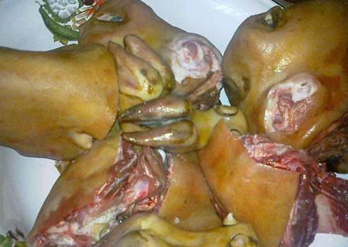 - Tar het hoofd en de hoeven boven een vuur om eventueel achtergebleven haar te verwijderen. Schraap ze er vervolgens af met een mes. Sla je hoofd en haal je hersens eruit. Spoel alles grondig af.