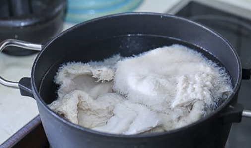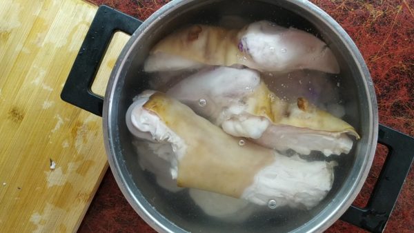 - Snijd het schoongemaakte litteken in verschillende stukken en vul met koud water. Zet op vuur en breng aan de kook, zet het vuur lager en laat sudderen tot het zacht is.